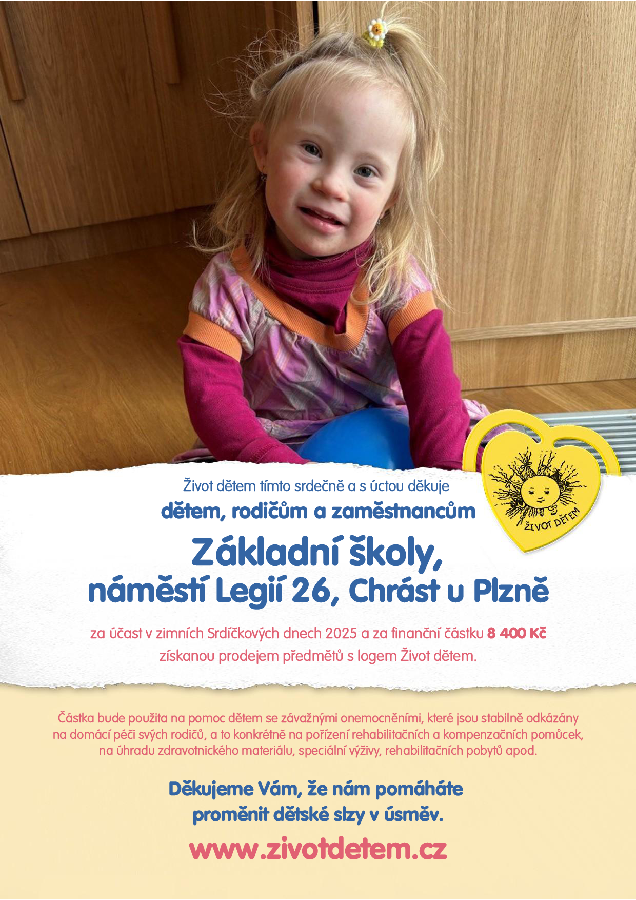 Také letos se zapojíme do akce společnosti Život dětem "Srdíčkové dny". Prodej bude probíhat ve středu 19. 11. a v pátek 21. 11. u hlavního vchodu, před výukou 7:15 - 7:35 a o velké přestávce 9:20 - 9:40.