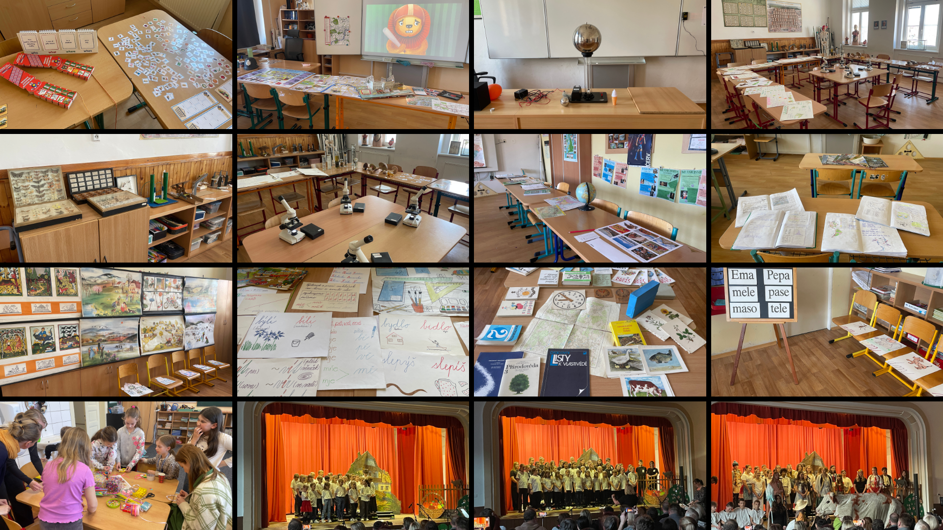 V pátek 27. března se naše škola otevřela všem zájemcům o nahlédnutí do školního zákulisí. V dopoledních hodinách se návštěvníci zúčastnili běžného vyučování napříč třídami, odpoledne pak byly připraveny aktivity v jednotlivých třídách. Na prvním stupni probíhaly tvůrčí dílny a otevřena byla provizorní kavárna, na druhém stupni si mohli návštěvníci vyzkoušet svoje znalosti z angličtiny a z přírodních věd. Připraveny byly i zajímavé chemické a fyzikální pokusy. Na závěr celého dne proběhlo hudební představení v Lidovém domě, kde žáci 5. - 7. ročníku vystoupili se svým zpracováním operetky "O dvanácti měsíčkách", které nacvičovali v hodinách hudební výchovy, a školní sbory zazpívaly několik písní ze svého repertoáru.